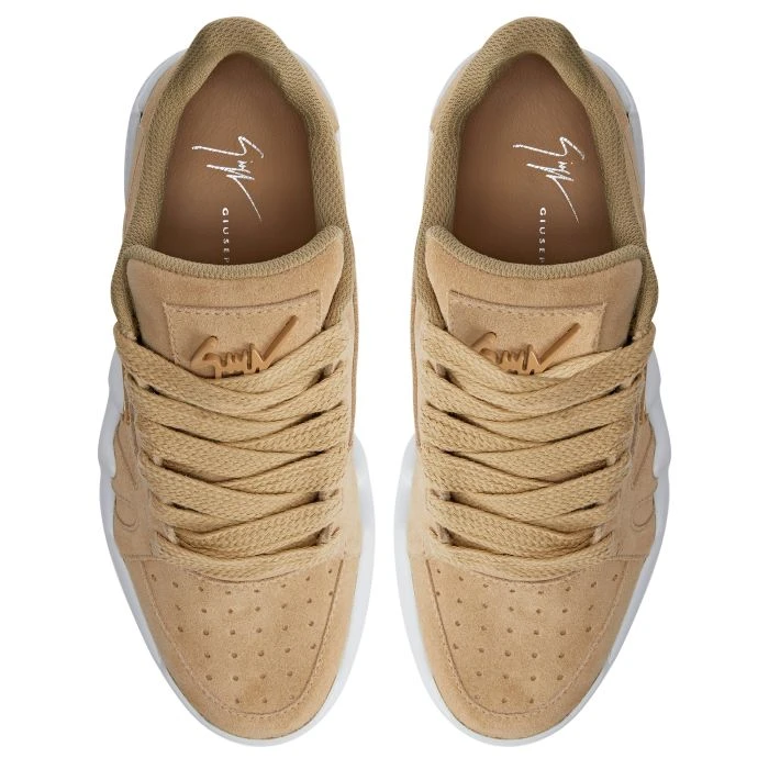 Mid-top ‘Talon’ sneakers crafted from beige velour, with matching technical fabric inner lining and cotton laces; the design features a beige lacquered metal ‘Signature’ on the tongue, a beige rubberised ‘Label Signature’ on the outer side of the upper and white rubber soles with a touch of beige on them.