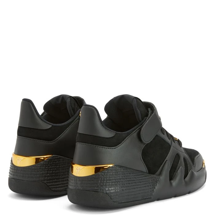 Low-top ‘Talon’ sneakers crafted from black leather and suede with technical fabric inner lining and matching cotton laces; the design features an upper-matching Velcro strap embellished with a golden detail, a black rubberised ‘Signature’ on the tongue and a black rubber sole with golden spoilers.