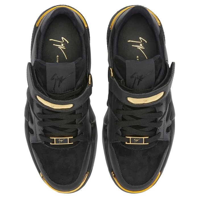Low-top ‘Talon’ sneakers crafted from black leather and suede with technical fabric inner lining and matching cotton laces; the design features an upper-matching Velcro strap embellished with a golden detail, a black rubberised ‘Signature’ on the tongue and a black rubber sole with golden spoilers.