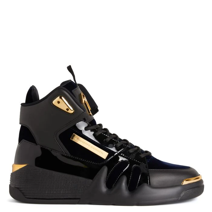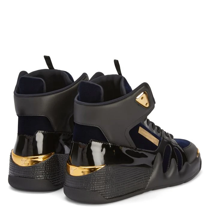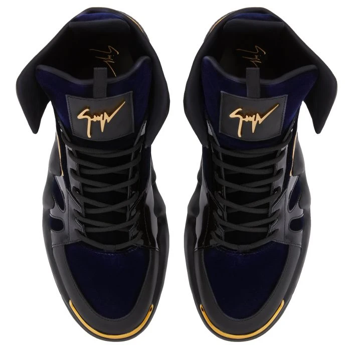 High-top ‘Talon’ sneakers crafted from blue-navy fabric with velvet effect, black patent leather and leather; the model features a technical fabric inner lining, matching cotton laces, a golden metal ‘Signature’ on the tongue, a golden metal ‘Label Signature’ on the outside and a black rubber sole with golden spoiler.