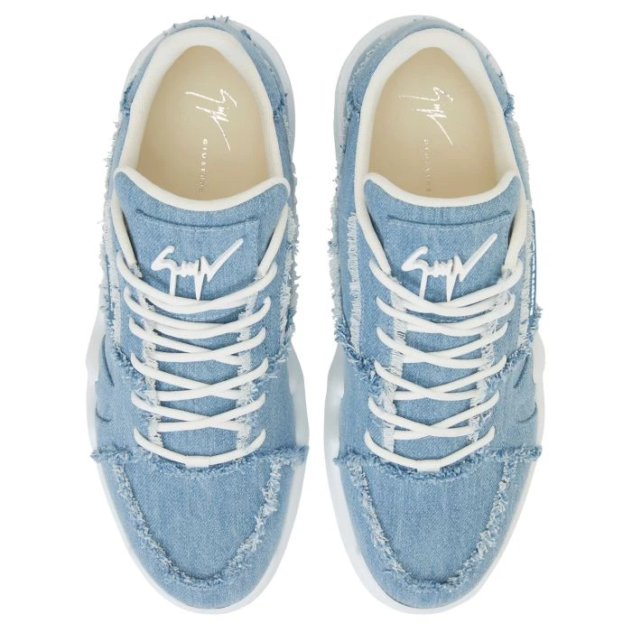 Low-top ‘Talon’ sneakers crafted from blue cotton with a jeans print and frayed trims, with white technical fabric inner lining and cotton laces; the design features a blue rubberised ‘Signature’ on the tongue and a white rubber sole.