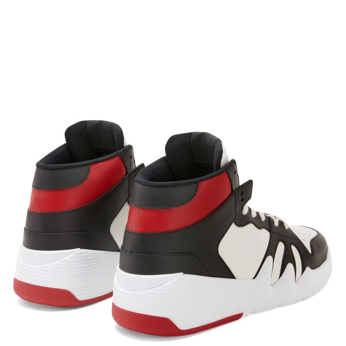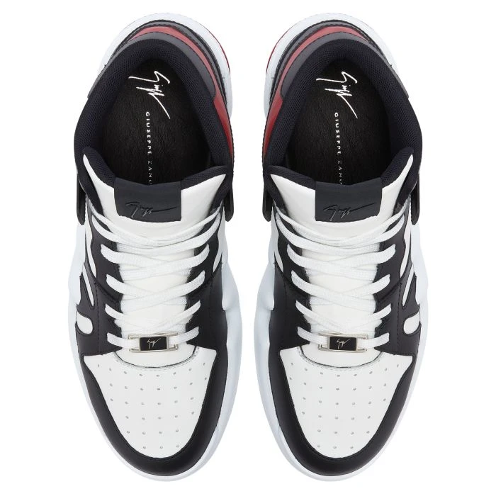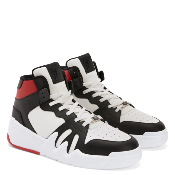 High-top ‘Talon’ sneakers crafted from black-and-white leather with a red leather detail, black technical fabric inner lining and white cotton laces; the design features a fabric ‘Signature’ detail with a black rubber logo and a white rubber sole with a touch of red on it.