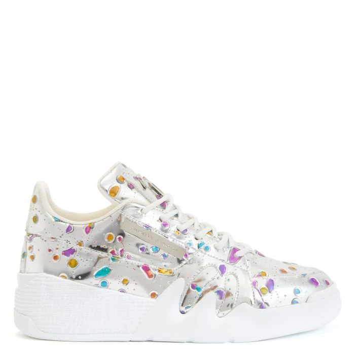 Low-top ‘Talon’ sneakers crafted from silver mirror-effect synthetic fabric, with white technical fabric inner lining and cotton laces; the design features 3D drop-shaped multicoloured rhinestones on the upper, a silver metal ‘Signature’ detail on the tongue, a silver metal ‘Label Signature’ on the outside and a white rubber sole.