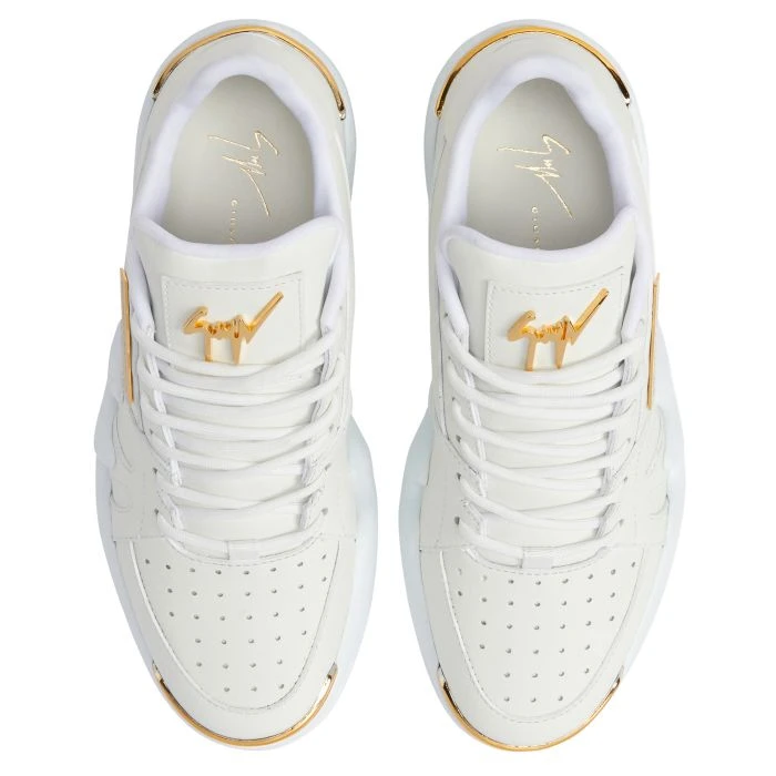 Low-top ‘Talon’ sneakers crafted from white leather, with technical fabric inner lining and matching cotton laces; the model features a golden metal ‘Signature’ on the tongue, a golden metal ‘Label Signature’ on the outside and a black rubber sole with golden spoiler.