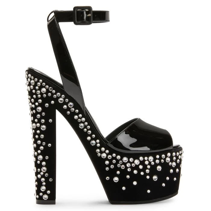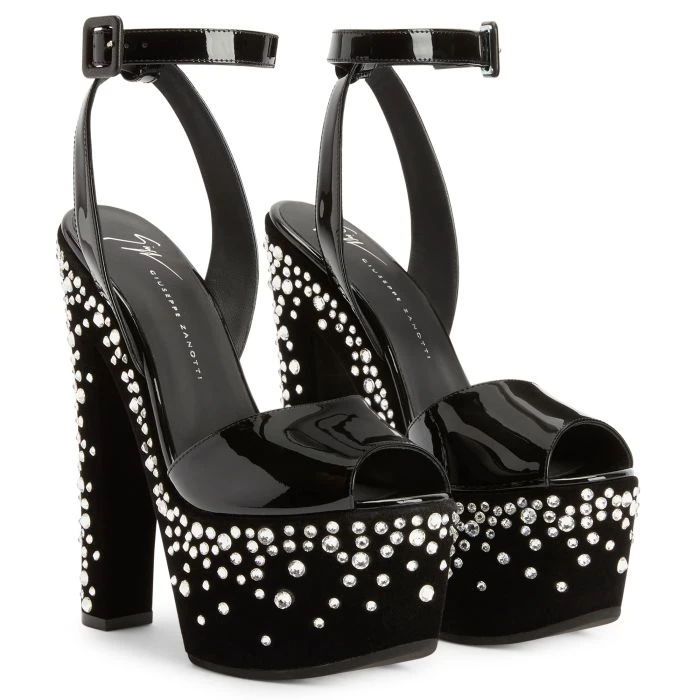 These peep-toe sandals crafted from black patent leather feature a synthetic suede effect fabric covered bottom, an adjustable ankle strap with an upper-matching small buckle and matching chunky platform and heels with crystal-coloured rhinestone embroidery.