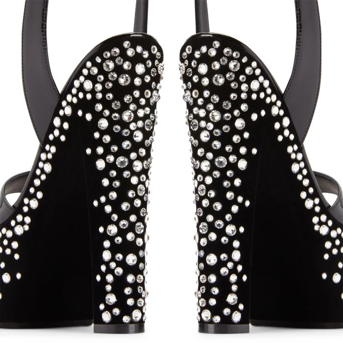 - Bottom covered in black suede-effect synthetic fabric (95% PL; 5% PU) with crystal-coloured strass embroidery
