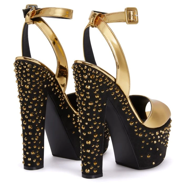 These peep-toe sandals crafted from mirror-effect synthetic fabric feature a suede-effect covered bottom, an adjustable ankle strap with an upper-matching small buckle and black chunky platform and heels with golden rhinestone embroidery.