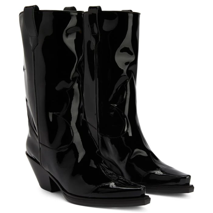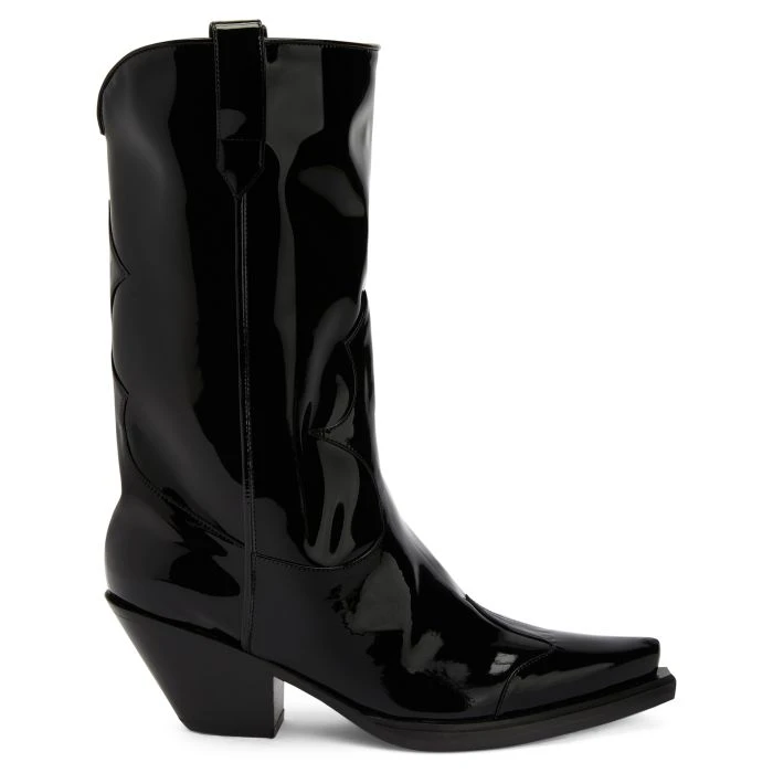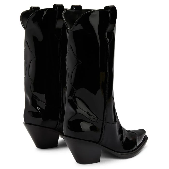 Cowboy boots crafted from black synthetic fabric with a patent leather effect, featuring matching details all along the upper, side pull tabs to ease the fit and black leather soles.