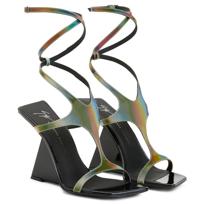 Crafted from multicoloured laminated synthetic fabric, these sandals have an upper that wraps around the foot up to the ankle, where there is an adjustable cross strap with a small side buckle. Complete with a leather sole, the design is characterised by its squared edges and peculiar silhouette, boasting an alluring and futuristic style.