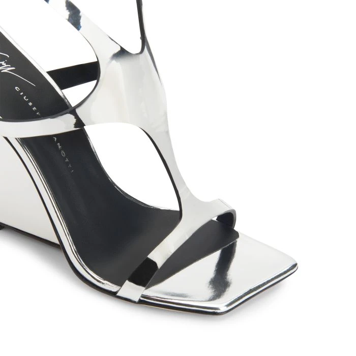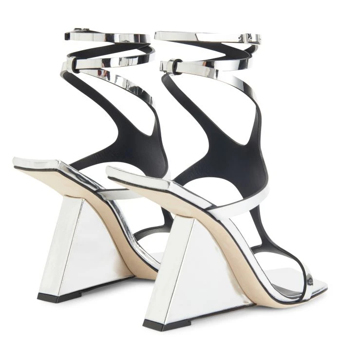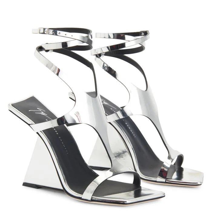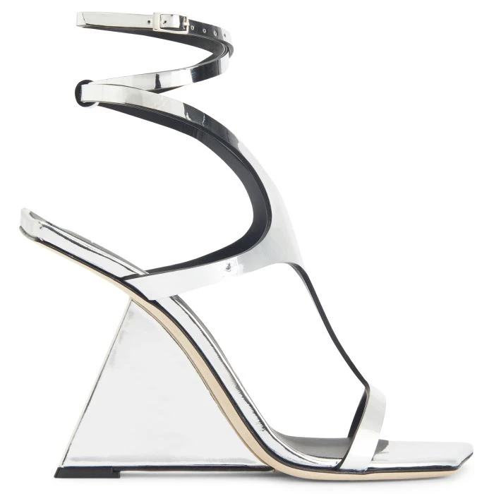 Made from reflective silver leather, this sandal has an upper that wraps around the foot up to the ankle, where there is a criss-crossing strap adjustable via a small side buckle. Complete with leather sole, this shoe is characterised by its squared edges and peculiar silhouette that gives it an alluring futuristic style.