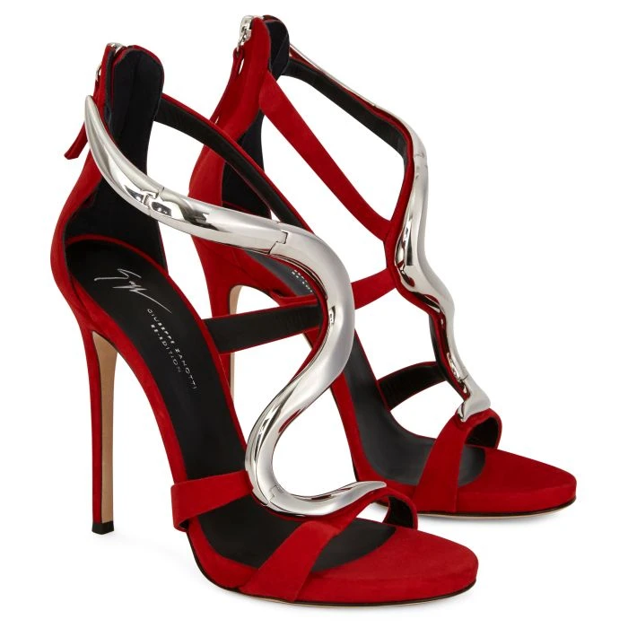 Presenting ‘Venere’, from the new “Giuseppe Zanotti Icons” project, the iconic stiletto sandal born in 2012 and remade from red suede with a metal ‘snake’ accessory. A new chapter in style for an iconic Zanotti shoe that transcends concepts of trend and season.