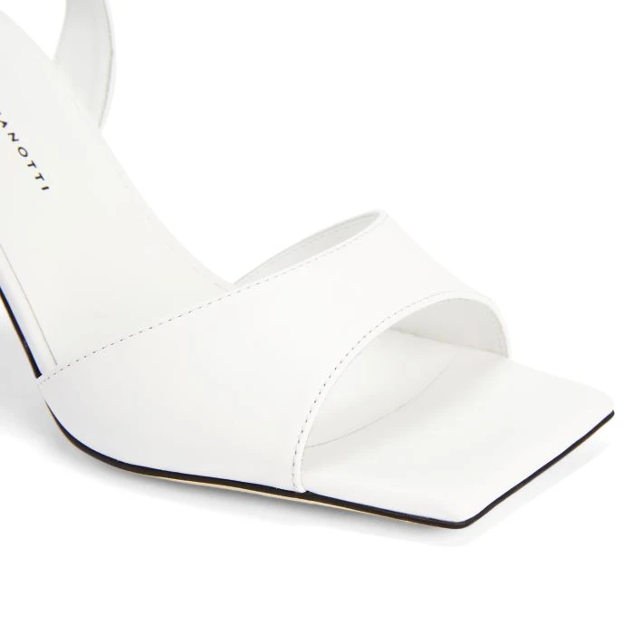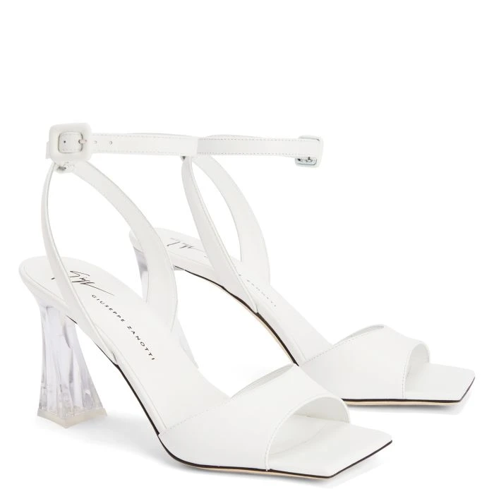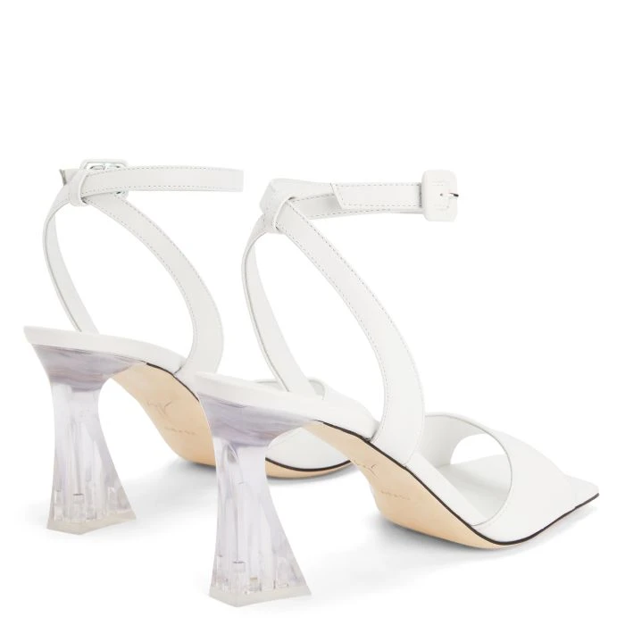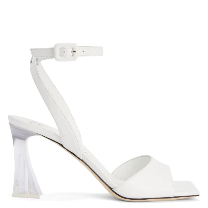 White leather sandals with matching leather soles, featuring a square toe, an ankle strap with adjustable buckle fastening at the side and a clear acetate spool heel.