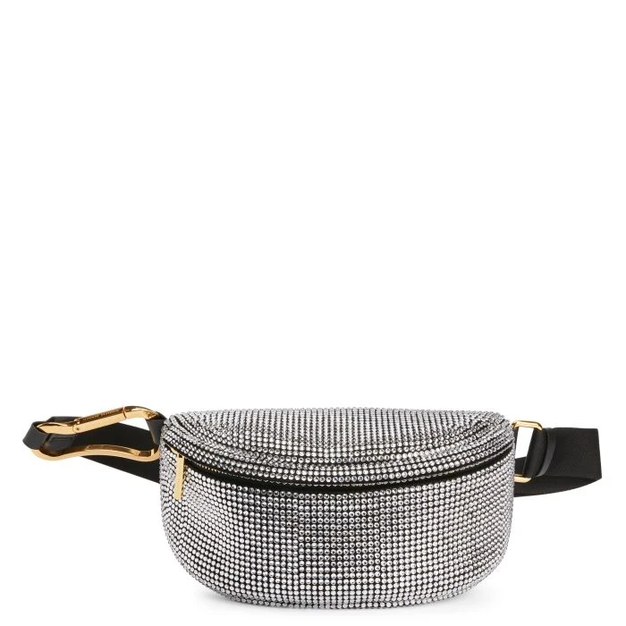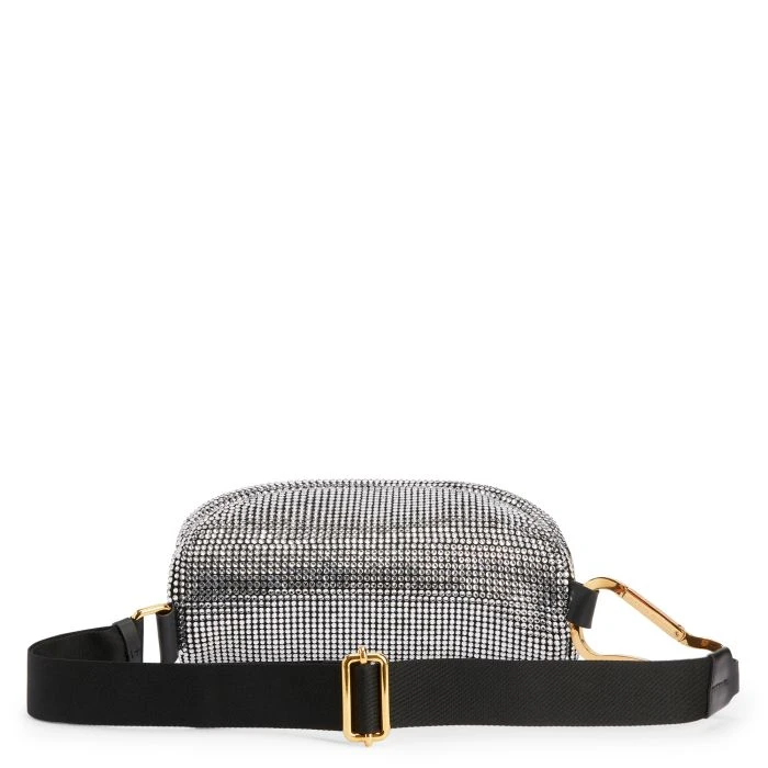 This belt bag is crafted from black suede-effect synthetic fabric and is embellished with an all-over crystal embroidery, golden metal chunky hardware and zipper puller, matching zipper closure and an adjustable shoulder strap; the iconic golden metal ‘Signature’ detail and the leather and fabric inner lining with card slots give the accessory a perfect finish.